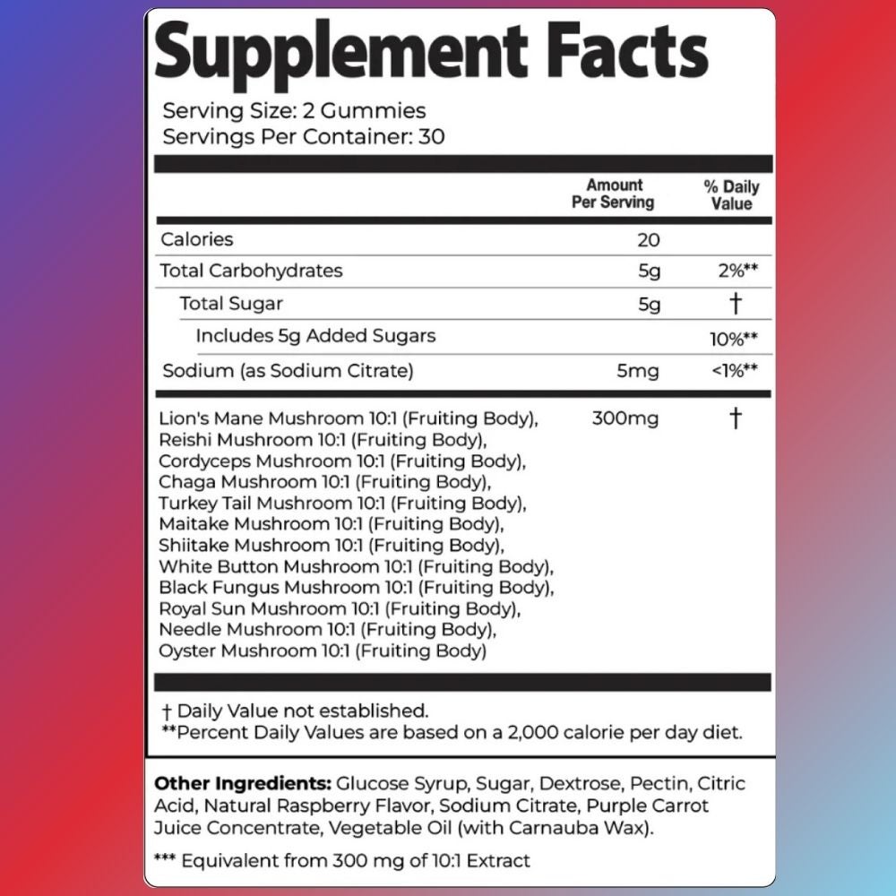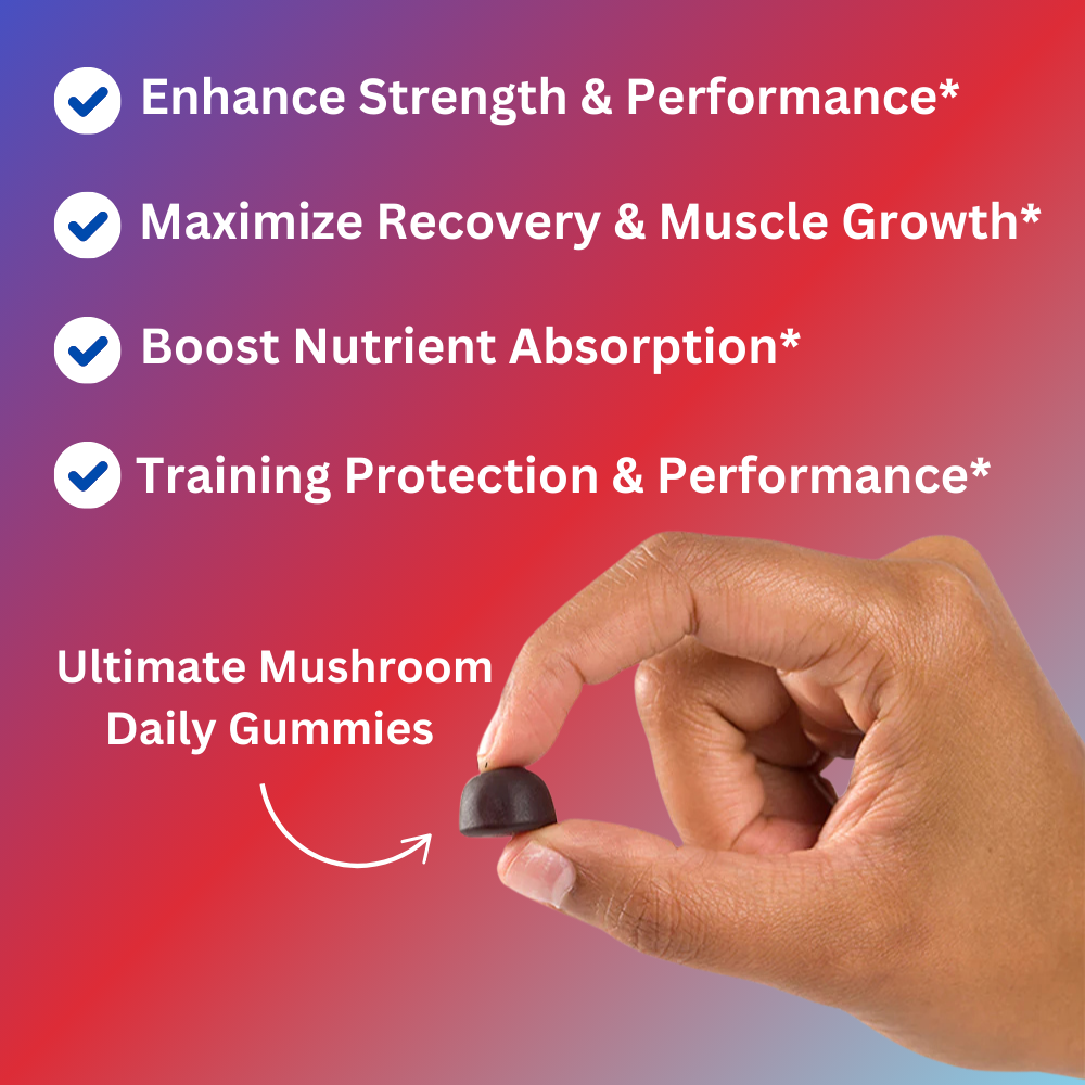 - A powerful, tasty mushroom gummy that maximizes gains, strength, stamina, and gym performance. Made to take every day as part of your fitness journey